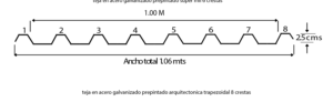 Tiene un ancho total de 1.06 metros y un ancho útil de 1 metro exacto, con un perfil más angosto que la Supermil. Sus 8 crestas están distribuidas a lo largo de la lámina con una altura de 25 milímetros, lo que genera una mayor frecuencia de apoyos tanto visuales como estructurales.